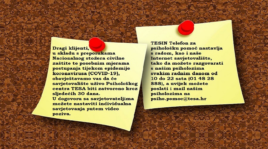 u skladu s preporukama Nacionalnog stožera civilne zaštite te posebnim mjerama postupanja tijekom epidemije koronavirusa (COVID-19), obavještavamo vas da će savjetovalište uživo Psihološkog centra TESA biti zatvoreno sljedećih 30 dana.